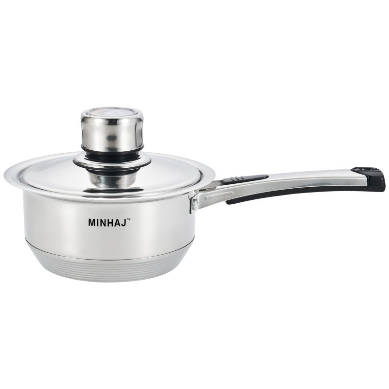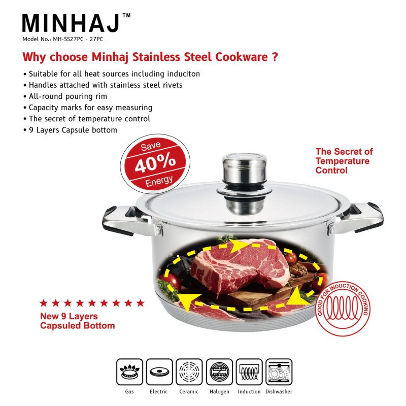 Minhaj 27 Piece Stainless Steel Cookware Set is a must-have for any kitchen. With its stylish and durable polished stainless steel construction, this set features all the essential pots and pans you need for cooking. The fully encapsulated, thick core base provides fast and even heat distribution, making it compatible for use on all stovetops and ovens.
