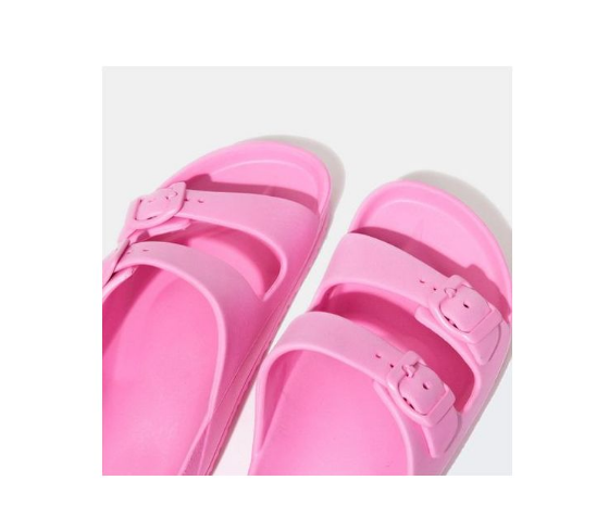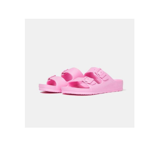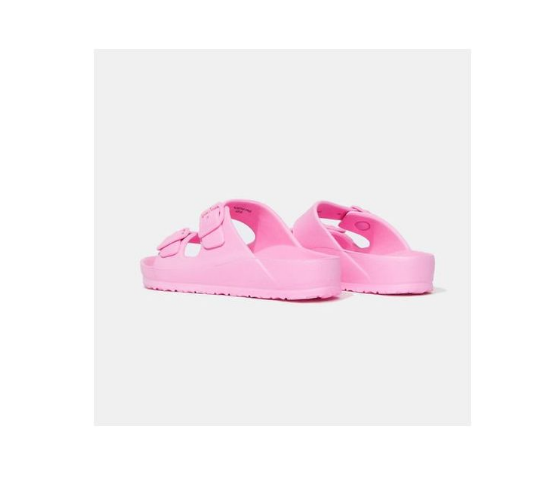 These adorable pink slippers feature a comfortable double band design with adjustable buckles. Perfect for little fashionistas!