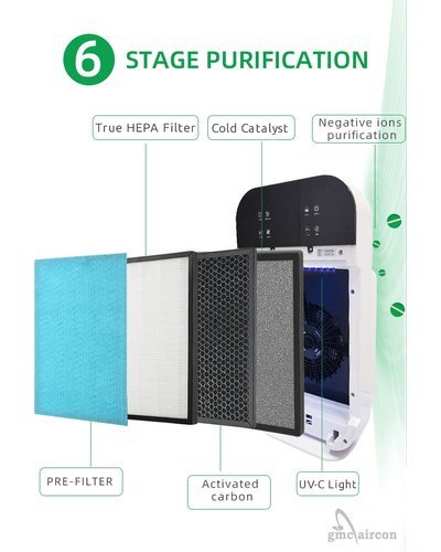 The GMC280AP Air Purifier system offers extremely high air filtration efficiency capturing up to 99.97% of particles including allergens, pollen, dust, smoke and pet dander. This is done by means of an advanced 6 stage filter system including Pre-Filter, HEPA Filter, Activated Carbon, Cold Catalyst, UVC light and Negative Ions purification. The UV-C light filter acts as a standalone air sanitizer to specially kill the germs, mould spores, mildew, bacteria and viruses. The GMC280AP has a clean air delivery rate (CADR) of 280/m³ and is suitable for rooms sizes up to 40m2.