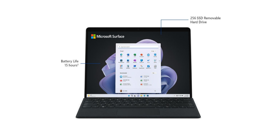12 Up to 15.5 hours of battery life based on typical Surface device usage. Testing conducted by Microsoft in August 2022 using preproduction software and preproduction Intel®12th Gen Core i5, 256GB, 8GB RAM device. Testing consisted of full battery discharge with a mixture of active use and modern standby. The active use portion consists of (1) a web browsing test accessing eight popular websites over multiple open tabs, (2) a productivity test utilizing Microsoft Word, PowerPoint, Excel, OneNote, and Outlook, and (3) a portion of time with the device in use with idle applications. All settings were default except screen brightness was set to 150 nits with Auto-Brightness and Adaptive Colour disabled. Wi-Fi was connected to a network. Tested with Windows Version 11.0.22621 (21H2). Battery life varies significantly with settings, usage, and other factors.