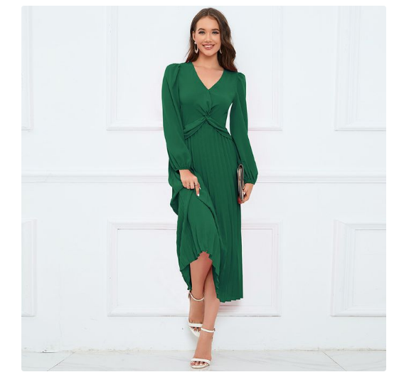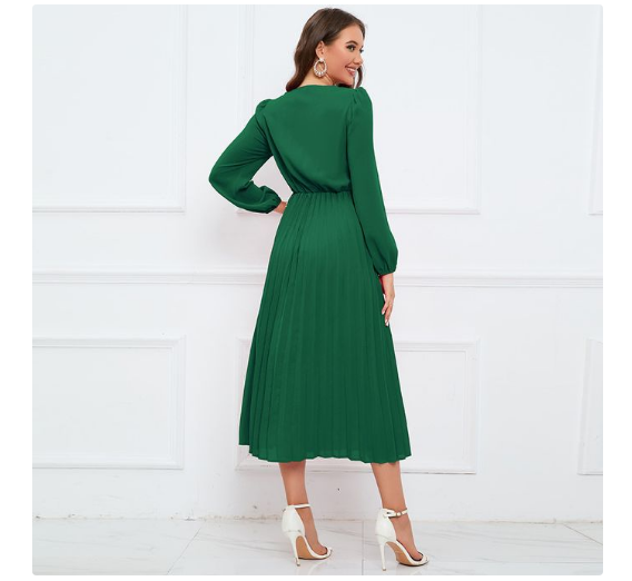 The Women’s Long Sleeve V-neck Slim Pleated Long Dress with Lantern Sleeves features a flattering V-neckline, a slim fit, and elegant pleats.