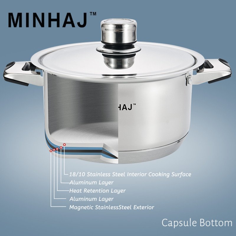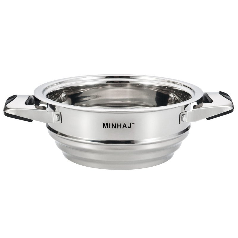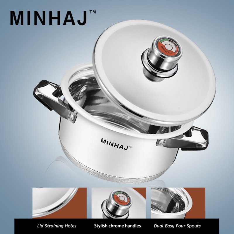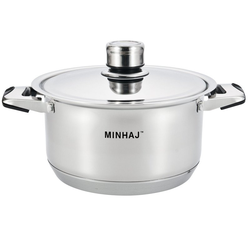 Minhaj 27 Piece Stainless Steel Cookware Set is a must-have for any kitchen. With its stylish and durable polished stainless steel construction, this set features all the essential pots and pans you need for cooking. The fully encapsulated, thick core base provides fast and even heat distribution, making it compatible for use on all stovetops and ovens.